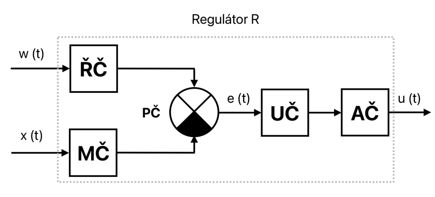 • [u] – Akční veličina – Výstupní veličina z regulátoru a současně vstupní veličina do regulované soustavy.