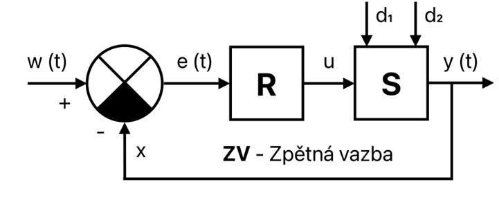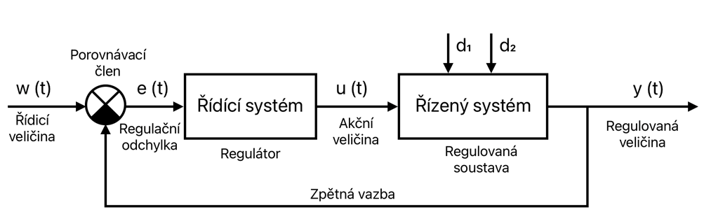 • [w] – Řídící veličina – Je veličina, která nastavuje žádanou hodnotu regulované veličiny.