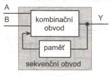 - Sekvenční obvody si pamatují předchozí stavy, takže jejich výstup závisí nejen na aktuálních, ale i minulých vstupech. Proto obsahují paměťové prvky a skládají se z kombinační a paměťové části.