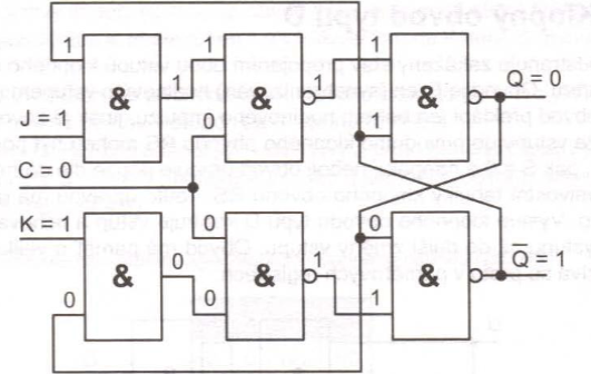 - Klopný obvod JK je zdokonalený synchronní obvod RS, který nemá zakázaný stav vstupních proměnných. To je docíleno přidáním součinových členů AND do vstupů S a R a zavedením zpětné vazby z výstupu klopného obvodu na vstup těchto členů AND. Zabránění vzniku zakázaného stavu je docíleno zajištěním jednoho nulového zpětnovazebního vstupu (je-li ) pro dolní součinový člen AND nebo druhého nulového zpětnovazebního vstupu (je-li ) pro horní součinový člen AND.